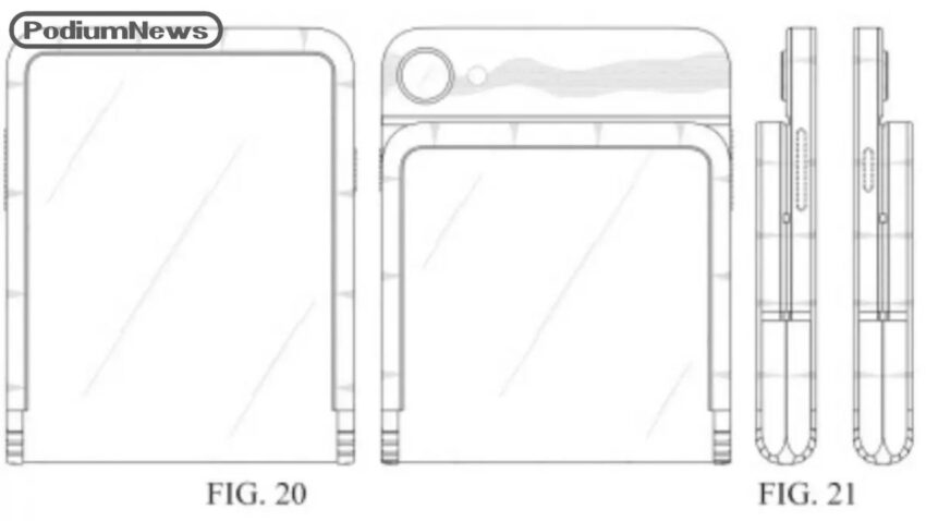 Paten tersebut juga menampilkan cutout kamera pada salah satu sisi layar yang kemungkinan berfungsi sebagai bagian belakang perangkat saat dilipat ke luar. Ini mengindikasikan bahwa Samsung telah memikirkan integrasi kamera dengan desain layar tunggal tersebut.